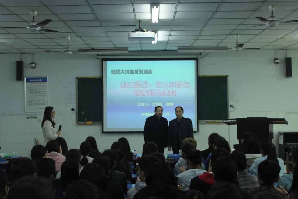 讲座前,首先进行了客座教授聘任仪式,我校程慎副校长给王怀民教授颁发了客座教授聘任证书。随后,王怀民教授作了题为《加工贸易、收入转移与城乡收入差距》的专题学术讲座,讲座回顾了中国加工贸易的发展历史和特点,介绍了中国城乡劳动力流动的特点和城乡收入差距的形成,对中国加工贸易与城乡劳动力流动、农村收入提高的内在联系进行了深入剖析,并采用实证方法说明了中国加工贸易迅速发展对城乡收入差距的影响。讲座内容丰富,数据详实,视野涵盖中外,不仅丰富了国际经济与贸易专业本科学生的专业理论知识,而且对国贸学院教师科研和教学活动的开展提供了重要的方法指导,受到师生的热烈欢迎。