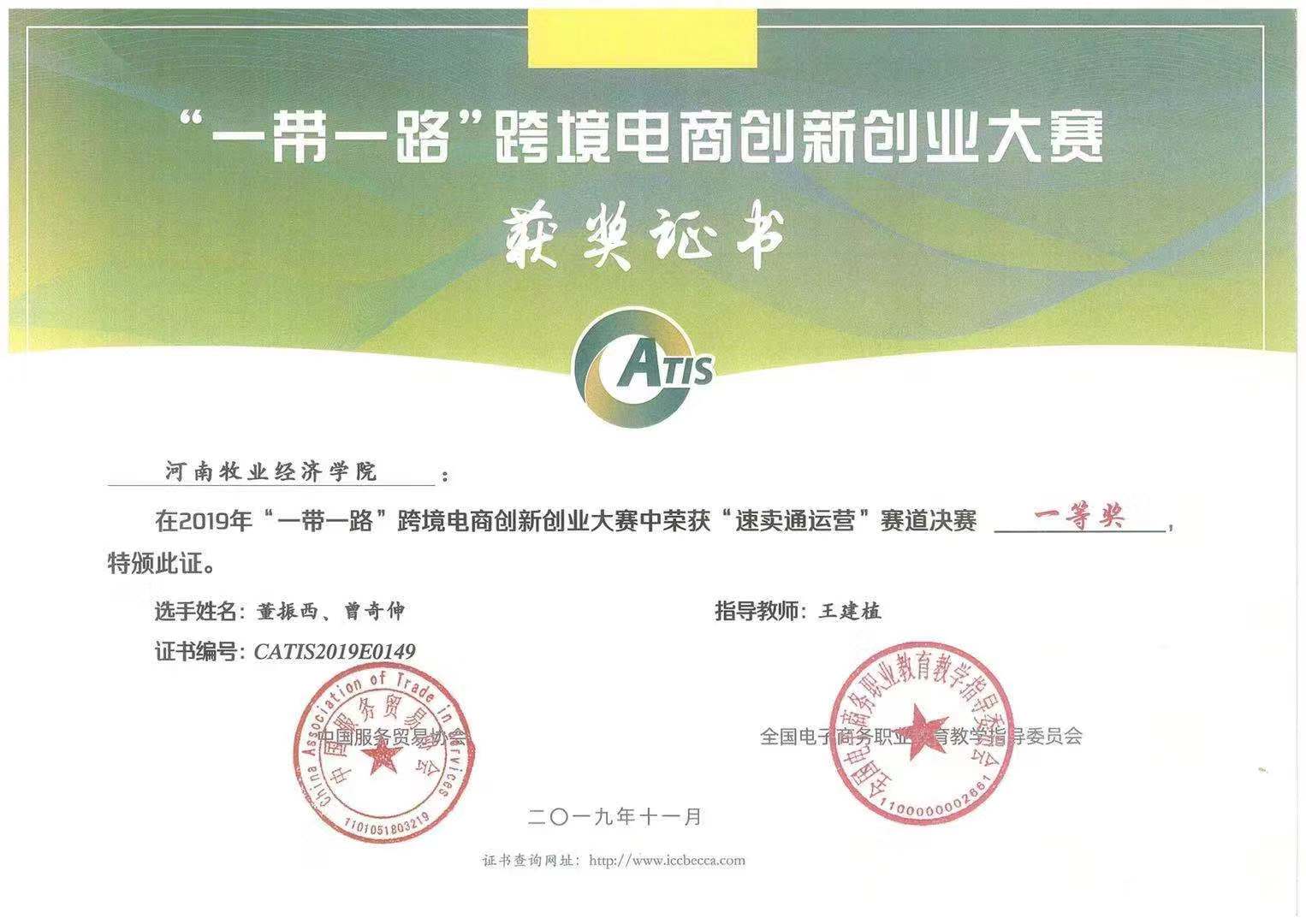 2019年12月15日,2019年“一带一路”跨境电商创新创业大赛速卖通赛道决赛成绩揭晓,世界杯体育官方网站有五支队伍参赛,在世界杯体育官方网站王建植老师和工商管理学院张滢老师指导下并分别获得全国速卖通赛道决赛一等奖两项、二等奖两项、三等奖一项,共计五个奖项。这五支获奖的团队的学生来自16级国际经济与贸易本科专业,获奖团队的名称分别是锦鲤队、奇袭队、winner和哥谭阿卡姆和一甲小队。