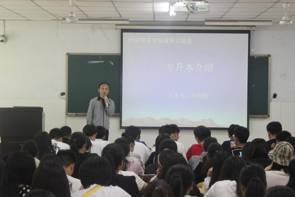 为帮助2018级学生了解更多专升本信息,做好未来的学习规划,经济贸易学院于5月9日下午2点半在W103教室举办了专升本专题讲座。此次讲座由世界杯经济学教研室主任周振鹏老师主讲,18级国贸一班、国贸二班、国贸跨境的全体专科同学参加了讲座。