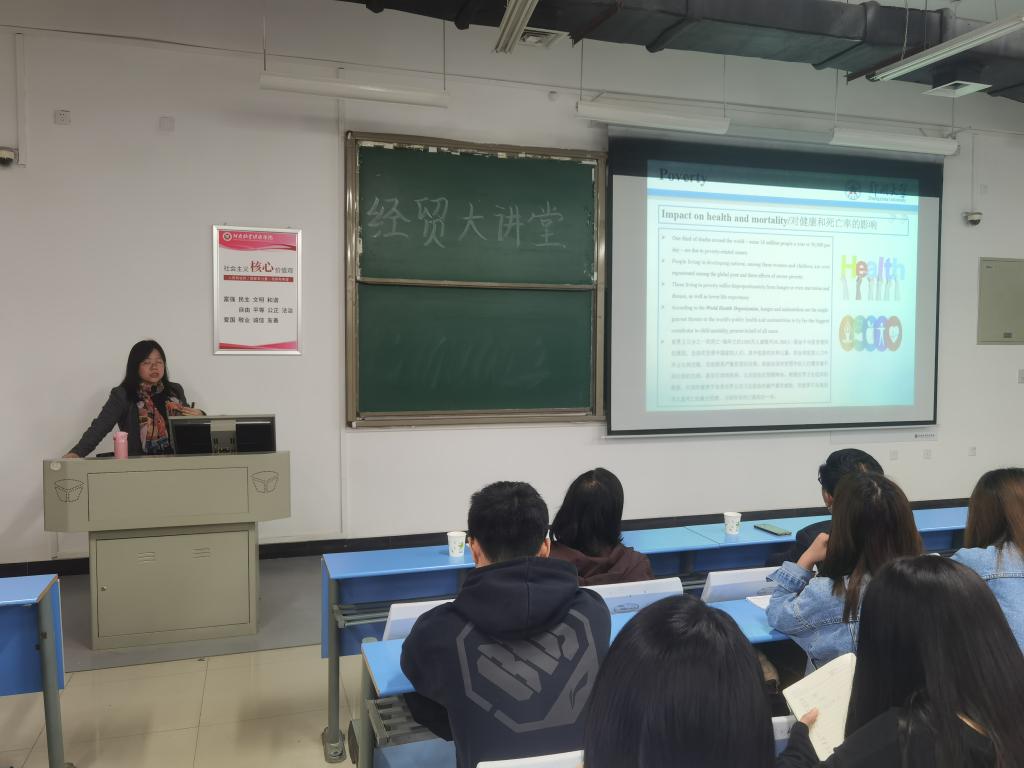 王芳博士首先以自己申请联合国粮食及农业组织工作的完整流程为切入点,向同学们介绍了自己在联合国粮农组织工作的基本情况;随后,王芳老师从联合国粮农组织架构、联合国可持续发展目标、相关领域研究热点等几个方面进行讲解;最后,王芳老师结合自身实践经验和国内外研究成果对“贫困”的相关理论知识及研究现状进行了详细的介绍。讲座图文并茂,生动有趣,现场掌声不断。