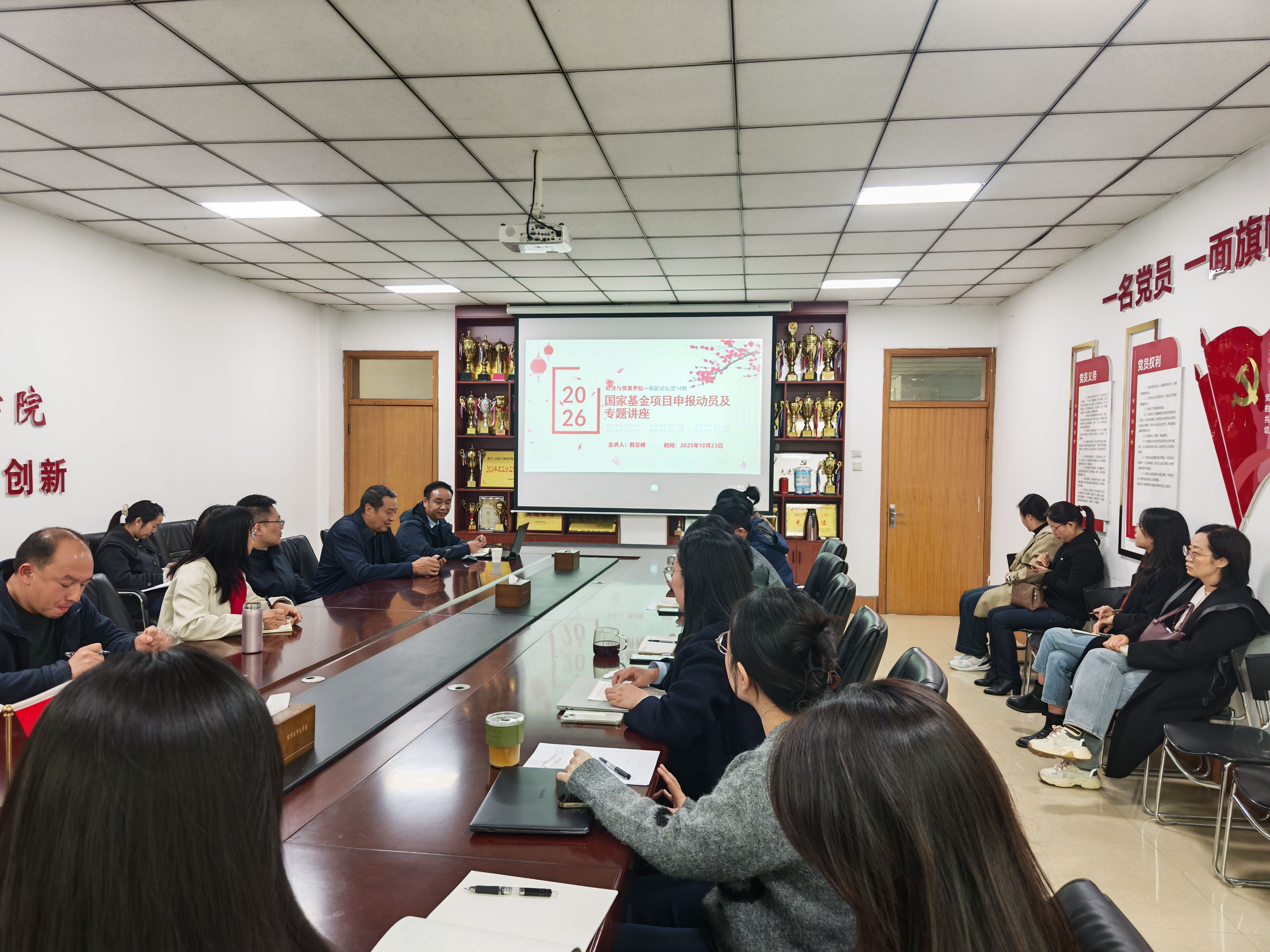为提升国家社科基金项目申报质量,强化教师科研能力,10月23日下午,世界杯体育官方网站在327会议室成功举办第14期“拓新论坛学术活动——2026年国家社科基金项目申报动员及专题讲座。活动特邀河南财经政法大学范蠡商学院院长、博士生导师韩亚峰教授作专题报告,学院领导班子、学术骨干及青年教师等20余人参会。会议由副院长杜玲主持。
