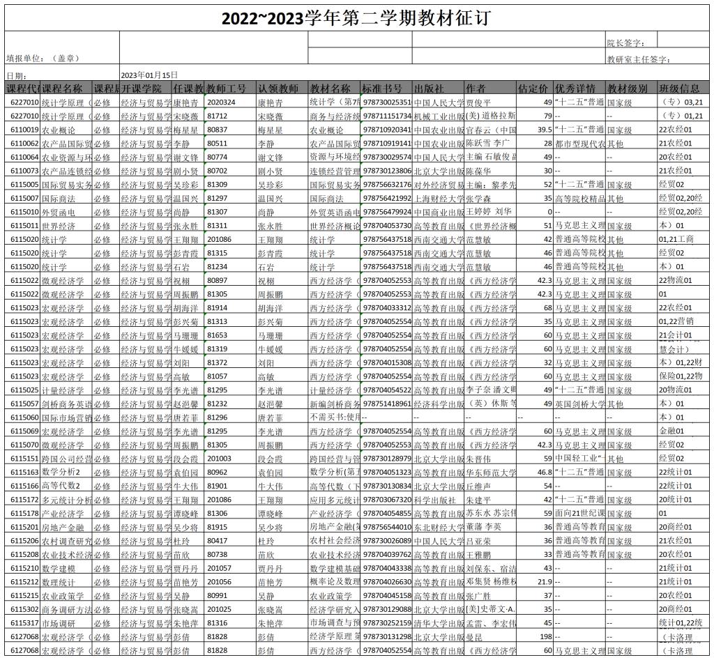 学期学生教材征订的通知》要求,在坚持优先考虑近三年出版的优秀教材和优先考虑国家、省部级精品规划教材、教指委及行职委推荐教材的基础上,经任课教师选定、教研室初审和院领导审核,拟选用以下教材为世界杯各门必修课程的选定教材(具体见附件),现予以公示。公示期为三天,从